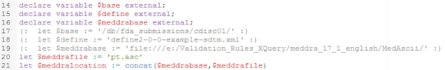 The first five lines in this part (18-22) define.the location of the define.xml file and of the MedDRA pt.asc (preferred terms file). For each of them, we use a "base" as we later want to enable that these are passed from an external program.